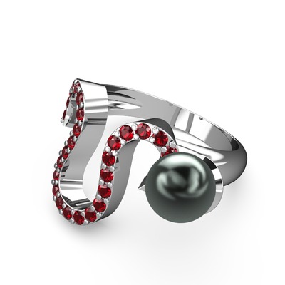Siyah inci ve garnet 18 ayar beyaz altın yüzük