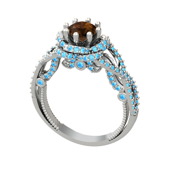 Dumanlı kuvars ve akuamarin 8 ayar beyaz altın yüzük