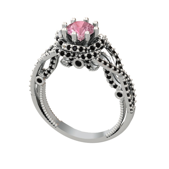 Pembe kuvars ve siyah zirkon 14 ayar beyaz altın yüzük