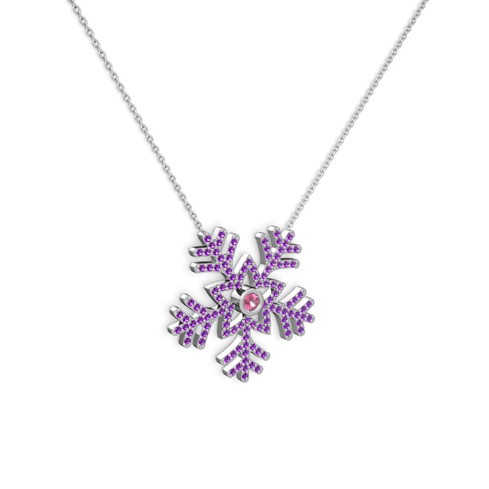 Pembe kuvars ve ametist 14 ayar beyaz altın kolye (40 cm gümüş rolo zincir)