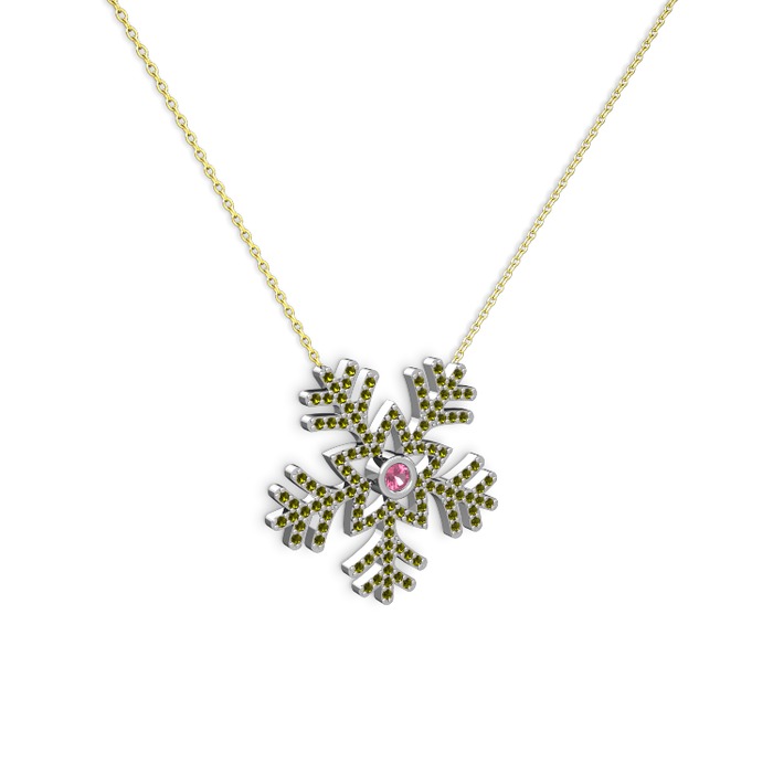 Pembe kuvars ve peridot 8 ayar beyaz altın kolye (40 cm gümüş rolo zincir)