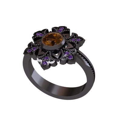 Dumanlı kuvars ve ametist 925 ayar siyah rodyum kaplama gümüş yüzük