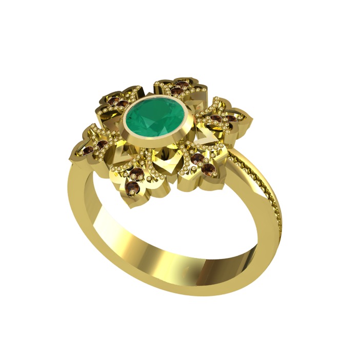 Kök zümrüt ve dumanlı kuvars 14 ayar altın yüzük