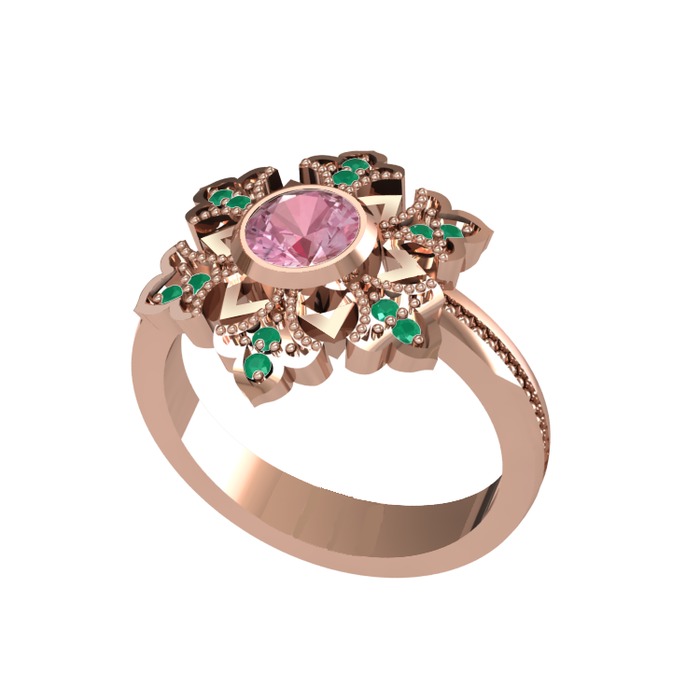 Pembe kuvars ve kök zümrüt 14 ayar rose altın yüzük