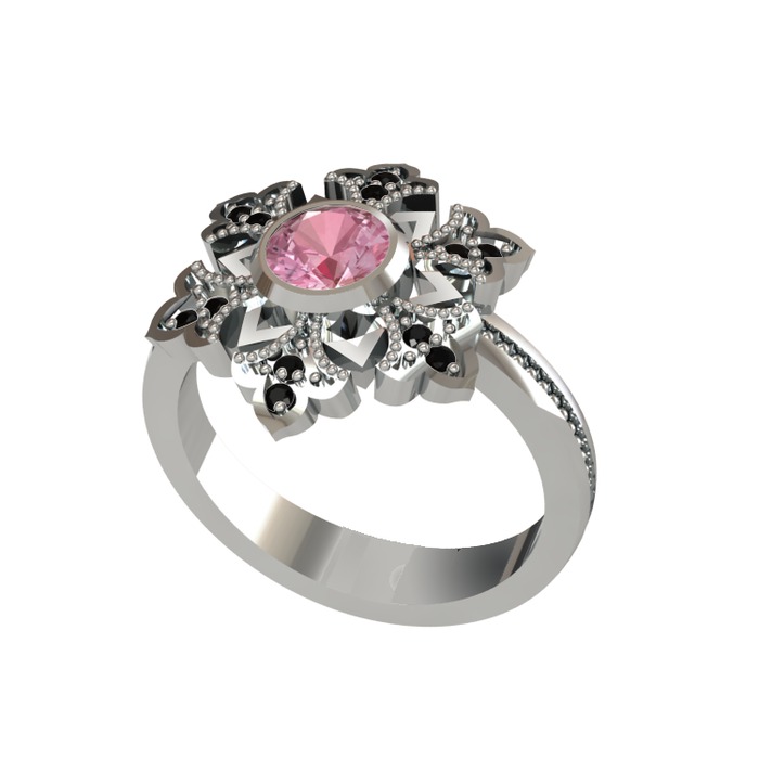 Pembe kuvars ve siyah zirkon 8 ayar beyaz altın yüzük