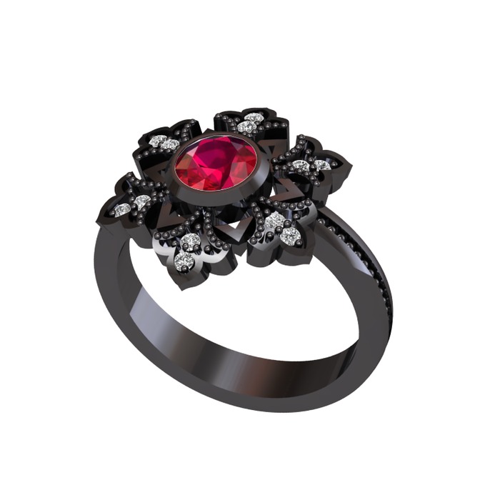 Rodolit garnet ve swarovski 925 ayar siyah rodyum kaplama gümüş yüzük