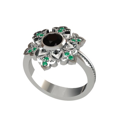Siyah zirkon ve kök zümrüt 8 ayar beyaz altın yüzük