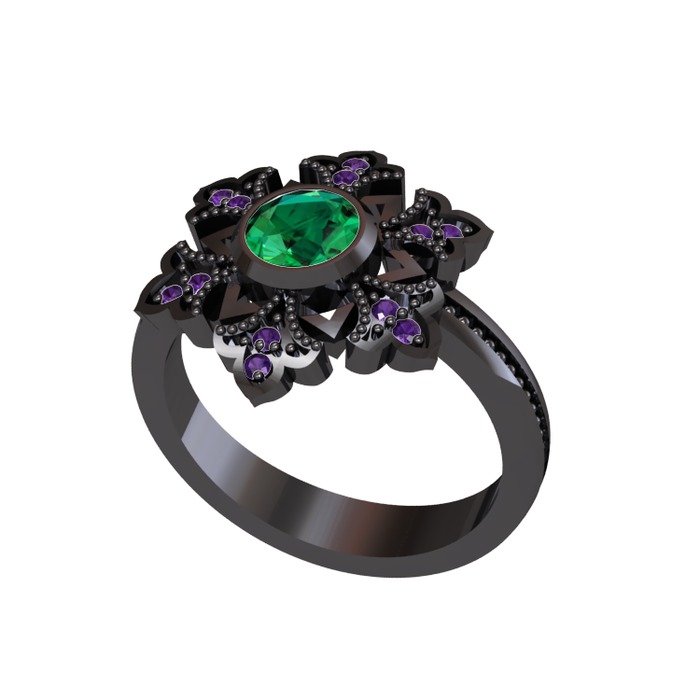 Yeşil kuvars ve ametist 925 ayar siyah rodyum kaplama gümüş yüzük