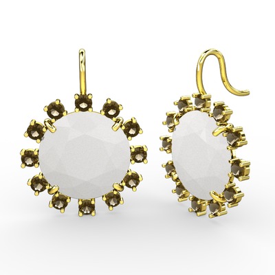 Dumanlı kuvars ve beyaz akrilik 925 ayar altın kaplama gümüş küpe
