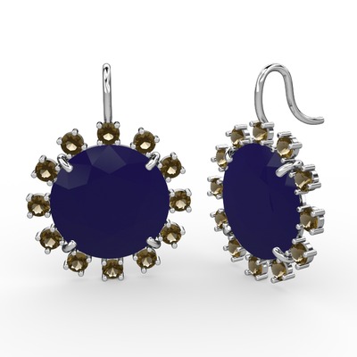 Dumanlı kuvars ve lacivert akrilik 8 ayar beyaz altın küpe