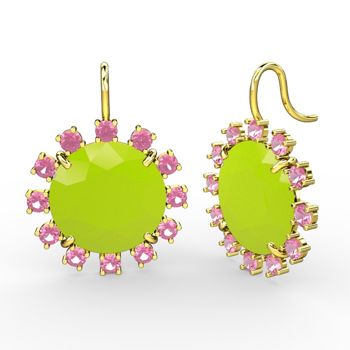 Pembe kuvars ve neon sarı akrilik 18 ayar altın küpe
