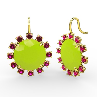 Rodolit garnet ve neon sarı akrilik 18 ayar altın küpe