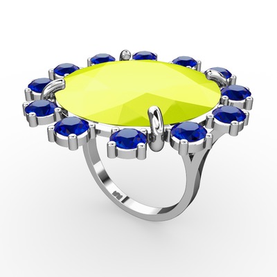 Neon sarı akrilik ve lab safir 925 ayar gümüş yüzük