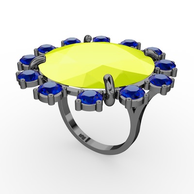 Neon sarı akrilik ve lab safir 925 ayar siyah rodyum kaplama gümüş yüzük