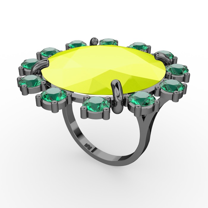 Neon sarı akrilik ve yeşil kuvars 925 ayar siyah rodyum kaplama gümüş yüzük