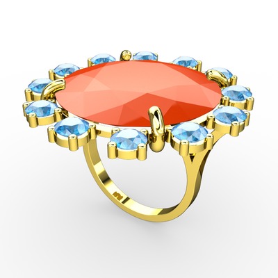 Neon turuncu akrilik ve akuamarin 18 ayar altın yüzük