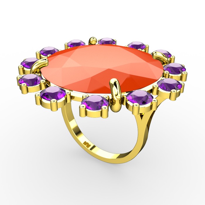 Neon turuncu akrilik ve ametist 14 ayar altın yüzük