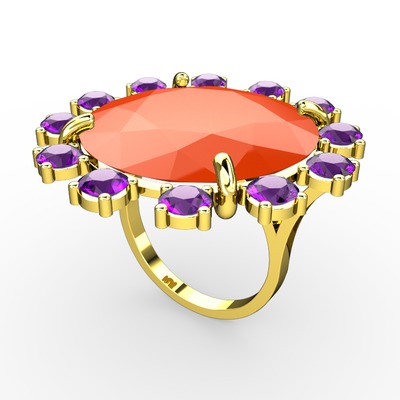 Neon turuncu akrilik ve ametist 18 ayar altın yüzük