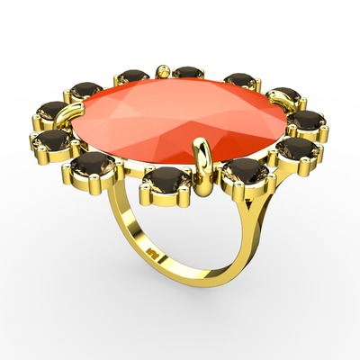 Neon turuncu akrilik ve dumanlı kuvars 18 ayar altın yüzük