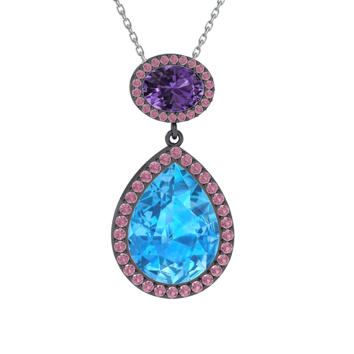 Akuamarin, ametist ve pembe kuvars 925 ayar siyah rodyum kaplama gümüş kolye (40 cm gümüş rolo zincir)