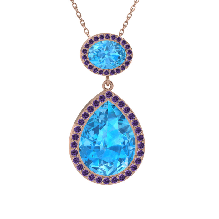 Akuamarin ve ametist 925 ayar rose altın kaplama gümüş kolye (40 cm gümüş rolo zincir)