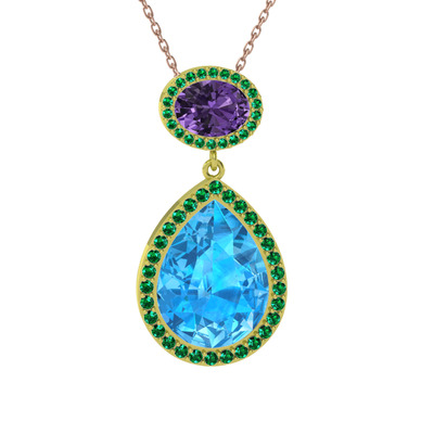 Akuamarin, ametist ve yeşil kuvars 18 ayar altın kolye (40 cm rose altın rolo zincir)