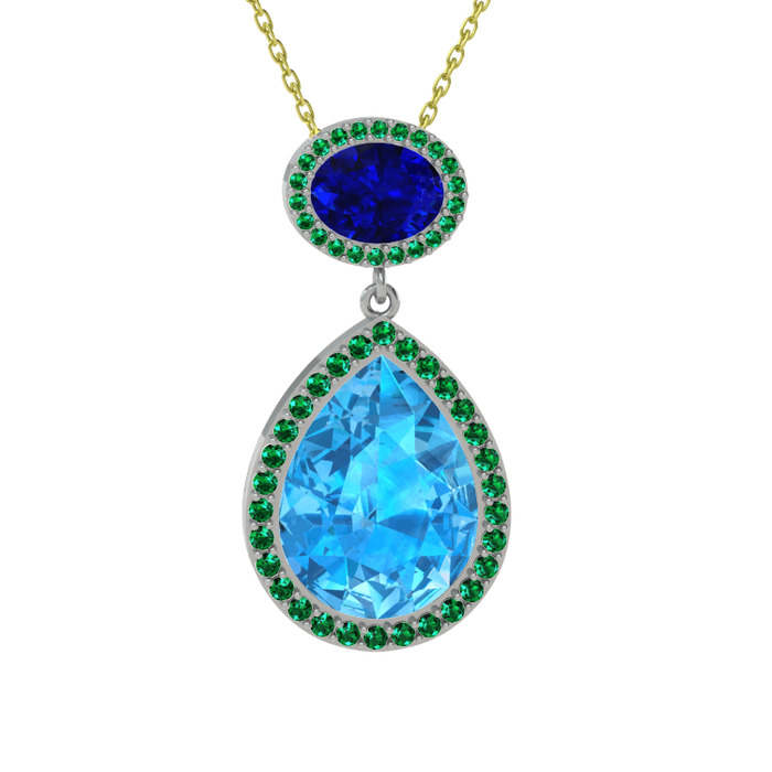 Akuamarin, lab safir ve yeşil kuvars 14 ayar beyaz altın kolye (40 cm altın rolo zincir)