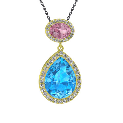 Akuamarin, pembe kuvars ve beyaz zirkon 925 ayar altın kaplama gümüş kolye (40 cm gümüş rolo zincir)