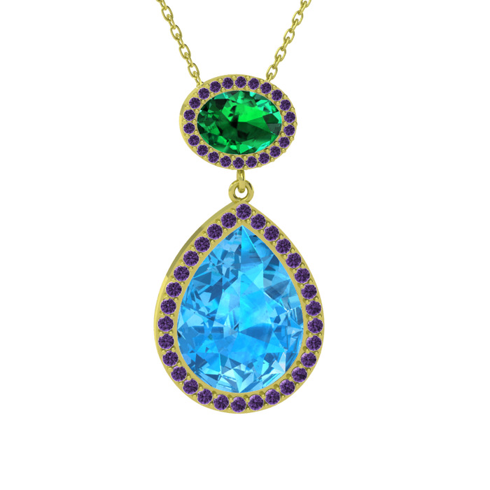 Akuamarin, yeşil kuvars ve ametist 925 ayar altın kaplama gümüş kolye (40 cm altın rolo zincir)