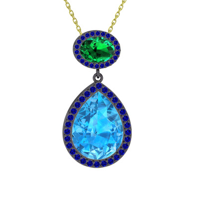 Akuamarin, yeşil kuvars ve lab safir 925 ayar siyah rodyum kaplama gümüş kolye (40 cm altın rolo zincir)