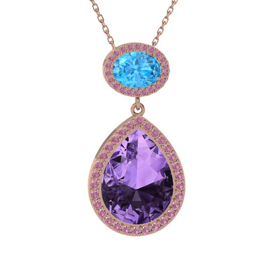 Ametist, akuamarin ve pembe kuvars 8 ayar rose altın kolye (40 cm rose altın rolo zincir)