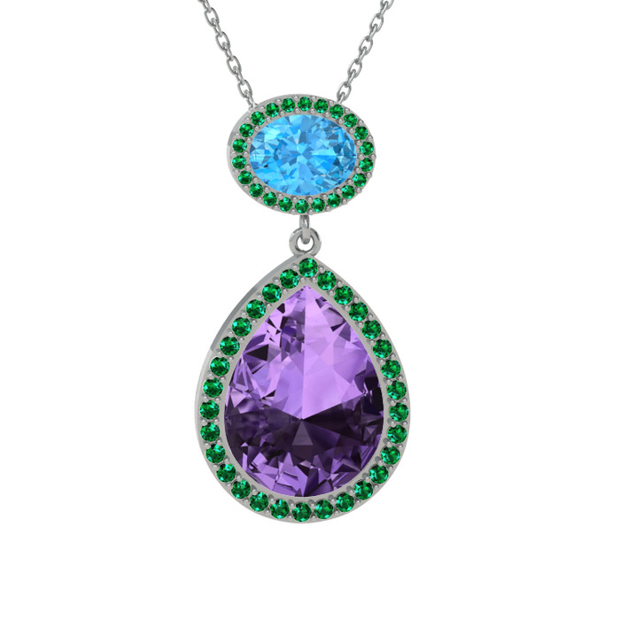 Ametist, akuamarin ve yeşil kuvars 18 ayar beyaz altın kolye (40 cm beyaz altın rolo zincir)