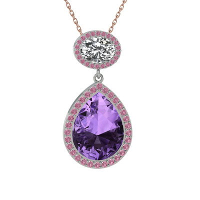 Ametist, beyaz zirkon ve pembe kuvars 925 ayar gümüş kolye (40 cm rose altın rolo zincir)