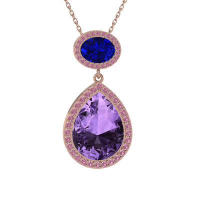 Ametist, lab safir ve pembe kuvars 14 ayar rose altın kolye (40 cm rose altın rolo zincir)