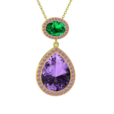 Ametist, yeşil kuvars ve pembe kuvars 8 ayar altın kolye (40 cm altın rolo zincir)