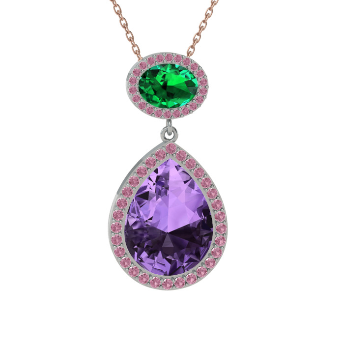 Ametist, yeşil kuvars ve pembe kuvars 8 ayar beyaz altın kolye (40 cm rose altın rolo zincir)