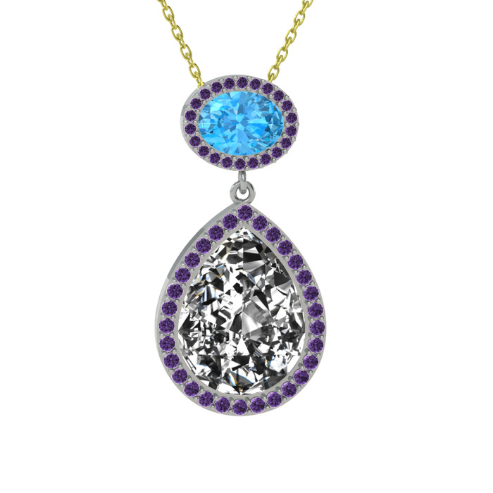Beyaz zirkon, akuamarin ve ametist 14 ayar beyaz altın kolye (40 cm altın rolo zincir)