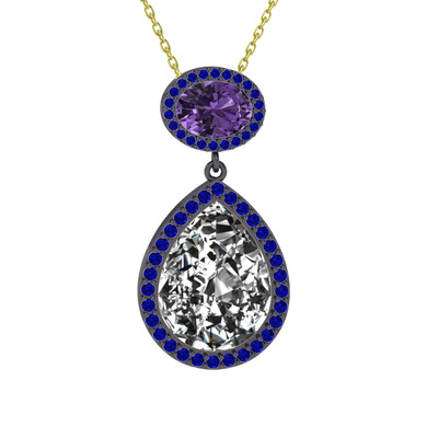 Beyaz zirkon, ametist ve lab safir 925 ayar siyah rodyum kaplama gümüş kolye (40 cm altın rolo zincir)