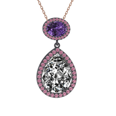 Beyaz zirkon, ametist ve pembe kuvars 925 ayar siyah rodyum kaplama gümüş kolye (40 cm rose altın rolo zincir)
