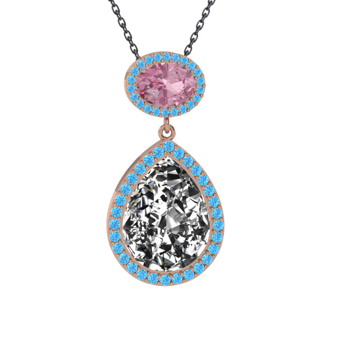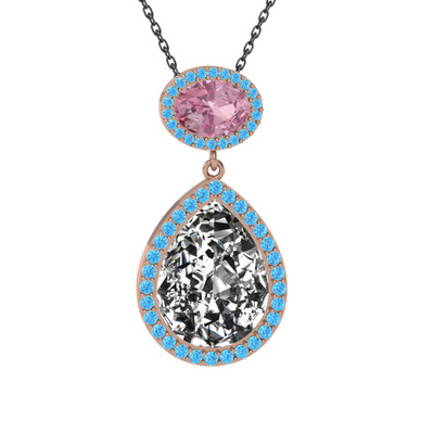 Beyaz zirkon, pembe kuvars ve akuamarin 8 ayar rose altın kolye (40 cm gümüş rolo zincir)