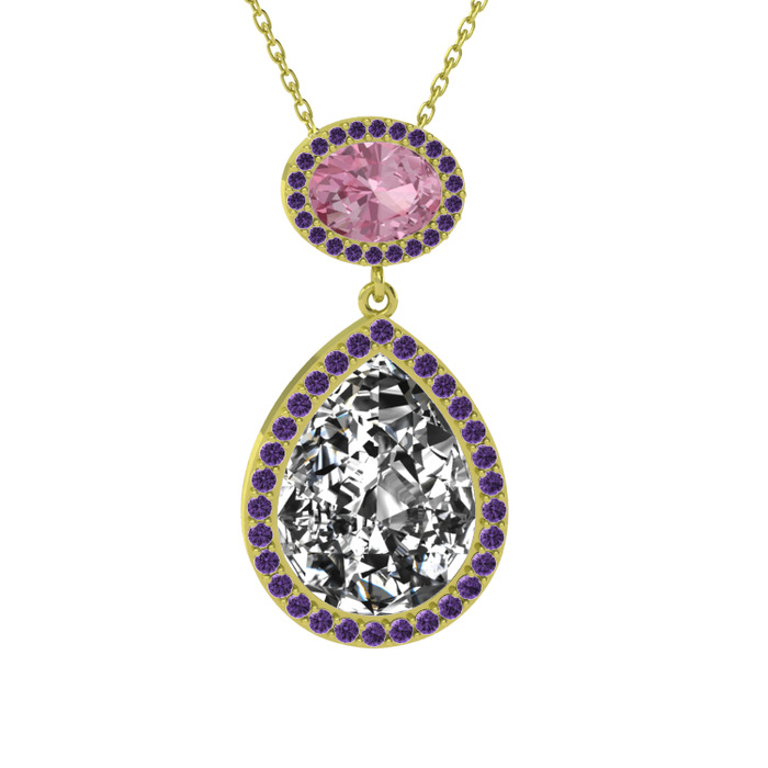 Beyaz zirkon, pembe kuvars ve ametist 925 ayar altın kaplama gümüş kolye (40 cm altın rolo zincir)
