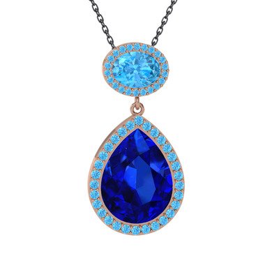 Lab safir ve akuamarin 925 ayar rose altın kaplama gümüş kolye (40 cm gümüş rolo zincir)