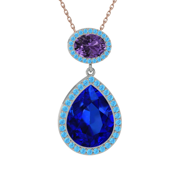 Lab safir, ametist ve akuamarin 8 ayar beyaz altın kolye (40 cm rose altın rolo zincir)