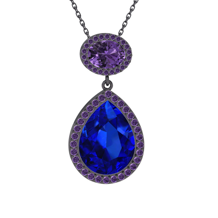 Lab safir ve ametist 925 ayar siyah rodyum kaplama gümüş kolye (40 cm gümüş rolo zincir)