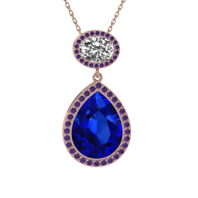 Lab safir, beyaz zirkon ve ametist 925 ayar rose altın kaplama gümüş kolye (40 cm rose altın rolo zincir)