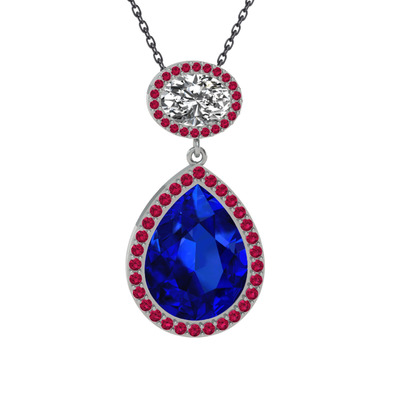 Lab safir, beyaz zirkon ve rodolit garnet 8 ayar beyaz altın kolye (40 cm gümüş rolo zincir)