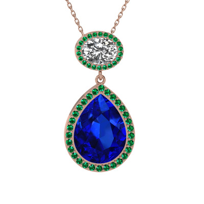 Lab safir, beyaz zirkon ve yeşil kuvars 14 ayar rose altın kolye (40 cm rose altın rolo zincir)
