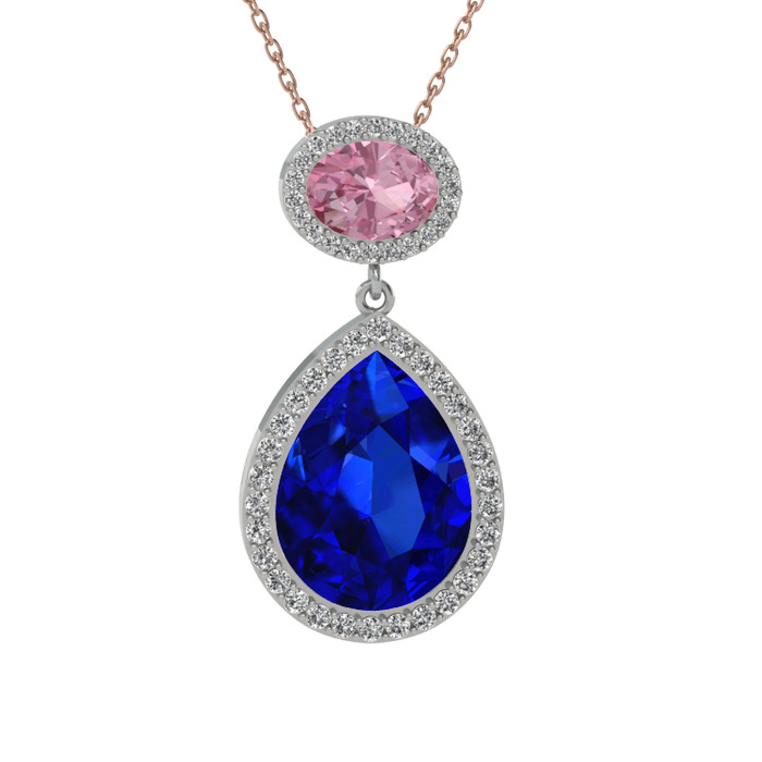 Lab safir, pembe kuvars ve beyaz zirkon 18 ayar beyaz altın kolye (40 cm rose altın rolo zincir)