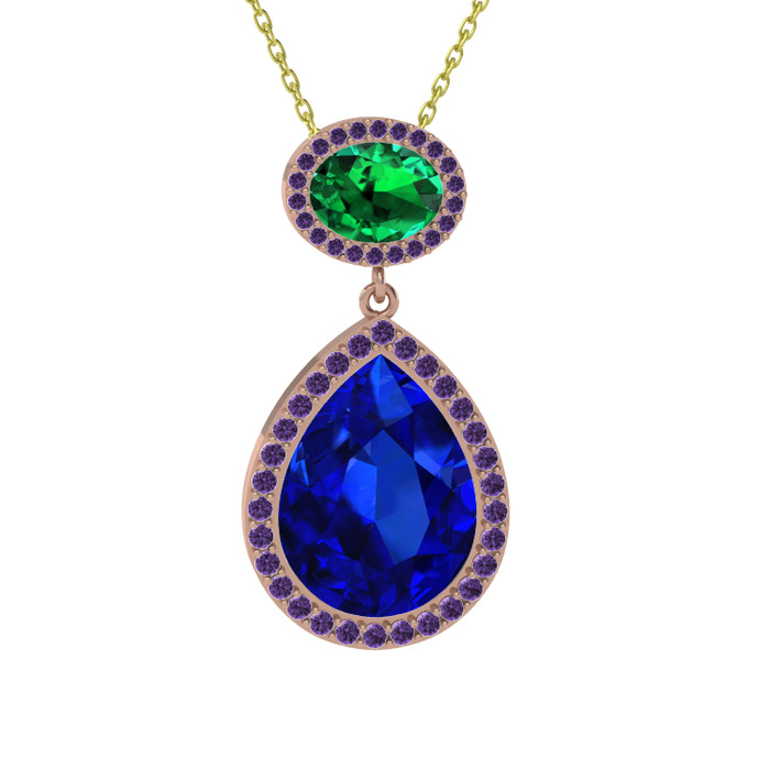 Lab safir, yeşil kuvars ve ametist 18 ayar rose altın kolye (40 cm gümüş rolo zincir)
