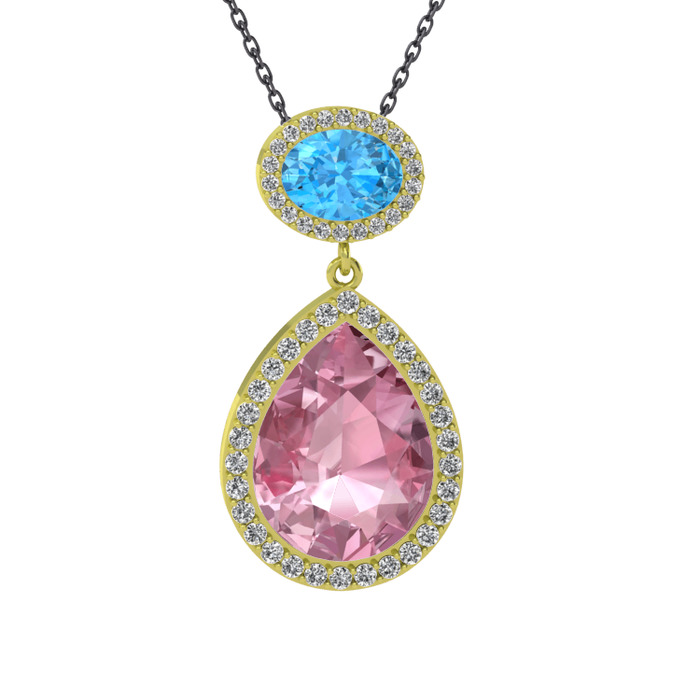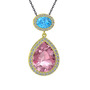 Pembe kuvars, akuamarin ve beyaz zirkon 925 ayar altın kaplama gümüş kolye (40 cm gümüş rolo zincir)